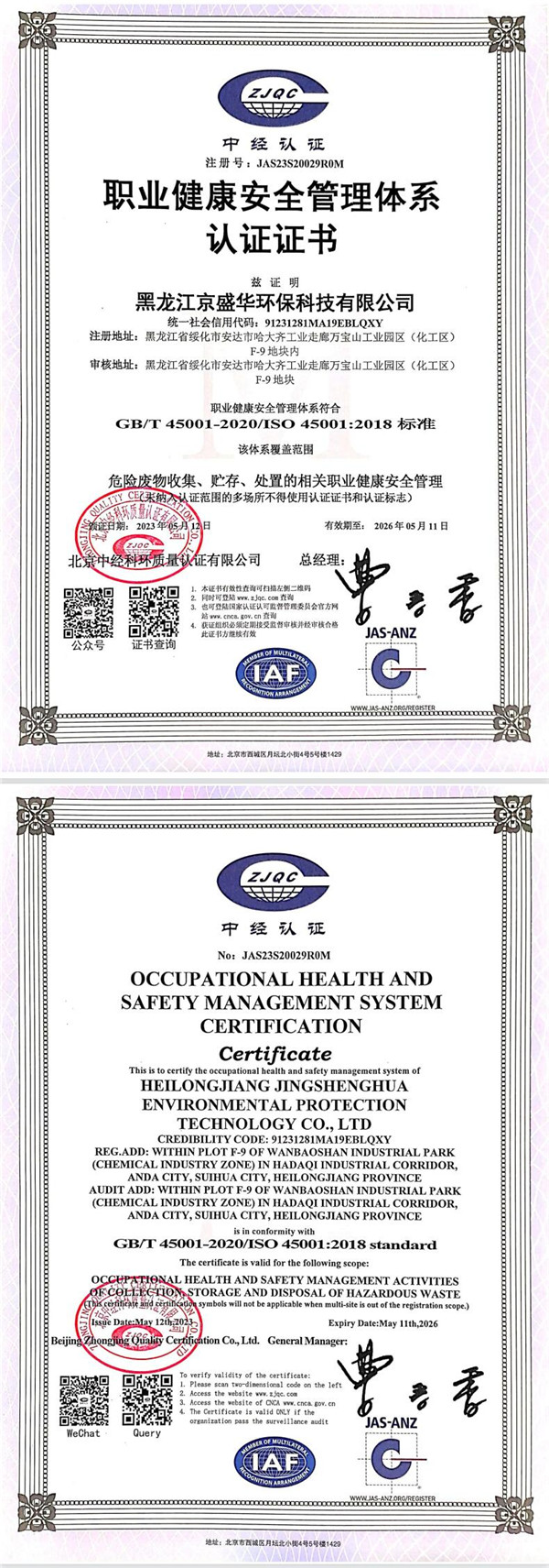 職業健康安全管理體系認證證書