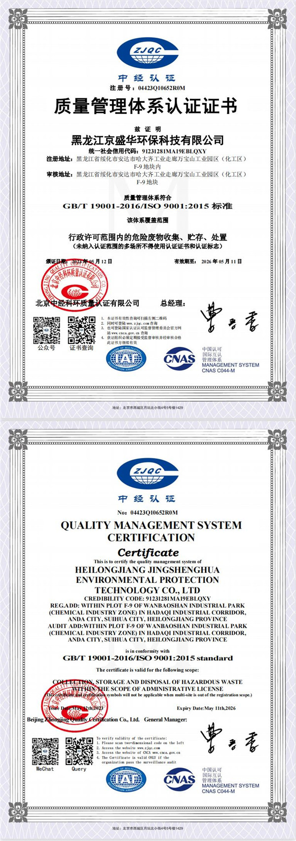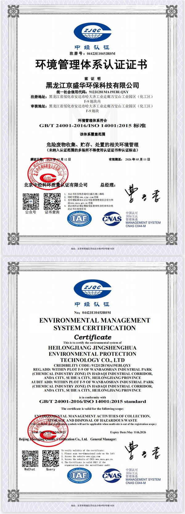 黑龍江京盛華環(huán)保科技有限公司固體廢物污染環(huán)境防治信息公示